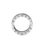 Inspired by the world-famous amphitheater, the Colosseum, the B.zero1 ring is a true expression of Bvlgari’s creative vision, challenging the very essence of jewellery design. Its unique, pure spiral shape symbolises the harmony of past, present and future ?C reflected in the magnificence of the Eternal City ?C and the pioneering spirit of the collection. B.zero1 four-band ring in 18K white gold.