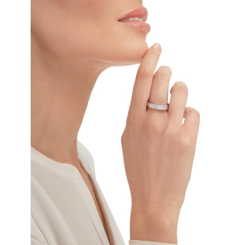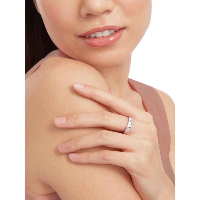 The B.zero1 Essential ring in 18K white gold and set with a single diamond is a modern interpretation of elegance rooted in Bvlgari’s Roman heritage. This ring is a reflection of the collection??s aesthetic, reinterpreting the prestigious Maison’s logo as a unique and timeless design element. This versatile piece can be easily layered to create a variety of modern and timeless looks, and it is a clever way to express your personality.