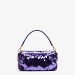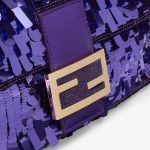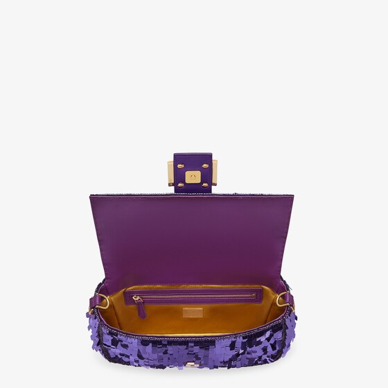 Iconic medium Baguette bag finely embroidered all-over with purple sequins of different shapes and sizes to create a 3D effect and decorated with an FF clasp. This style is a re-release of the original version first introduced in the Autumn/Winter 1999-2000 Collection. Features a front flap, tone on tone leather details and magnetic clasp. Internal compartment with zip pocket and gold-finish metalware. The bag can be carried by hand, or worn either on the shoulder or cross-body thanks to the leather handle and shoulder strap, both detachable.
