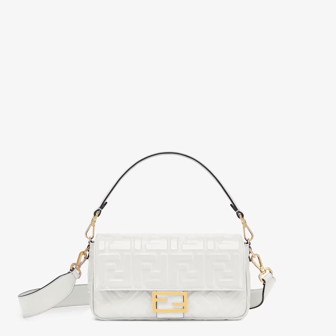 Iconic medium Baguette bag made of white soft nappa leather with a three-dimensional texture FF motif. Decorated with an FF clasp.