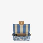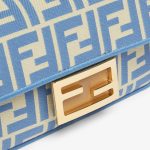 Iconic small Baguette bag made of jacquard fabric with the iconic FF motif in shades of light bue, embellished with light blue embroidered borders, beige leather details and embellished with an FF clasp.