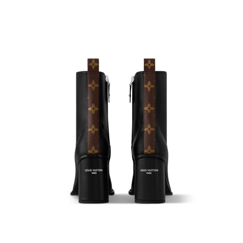 The Berlin ankle boot is crafted from supple calf leather for a stretchy, second-skin effect. The upper is complemented by an equally sleek, leather-covered heel in the shape of a half-Monogram Flower, which is embossed with the Louis Vuitton signature. This model was a highlight of Nicolas Ghesqui??re’s 10th anniversary show for the House.