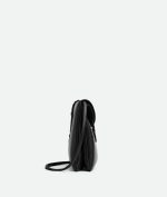 Cross-body bag in smooth calfskin leather with double flap and fastening system consisting of metal elements and coaxial cord