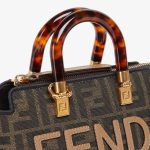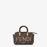 Iconic mini By The Way Boston bag, made of an FF motif jacquard fabric in brown with FENDI ROMA lettering in beige leather. Stiff tortoiseshell-effect plexiglass handles. Zip fastening.