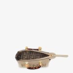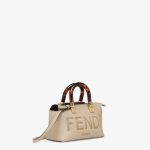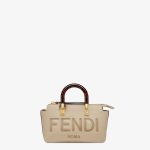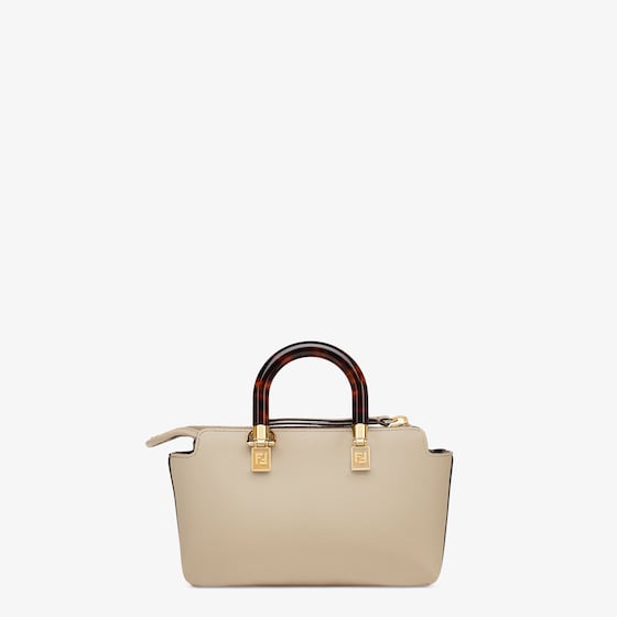 Iconic mini By The Way Boston bag made of dove gray leather with hot-stamped FENDI ROMA lettering and rigid tortoiseshell-effect plexiglass handles. Zip fastening.