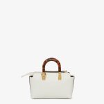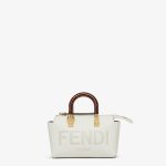 Iconic mini By The Way Boston bag made of white leather with heat-stamped FENDI ROMA lettering and rigid tortoiseshell-effect plexiglass handles. Zipper closure.