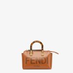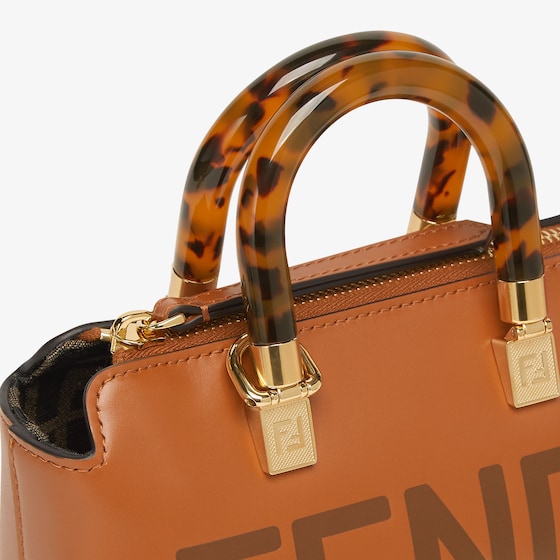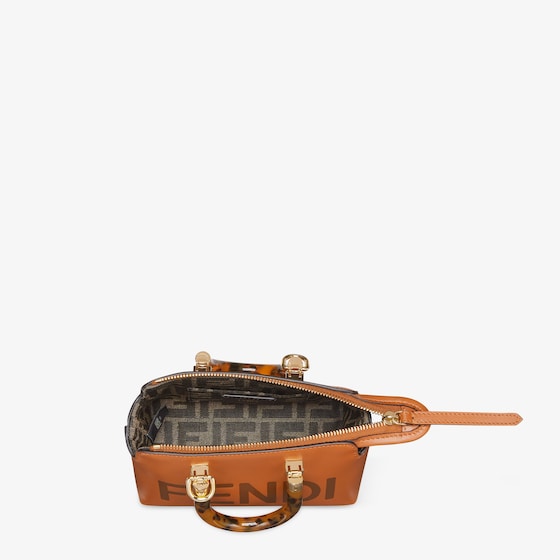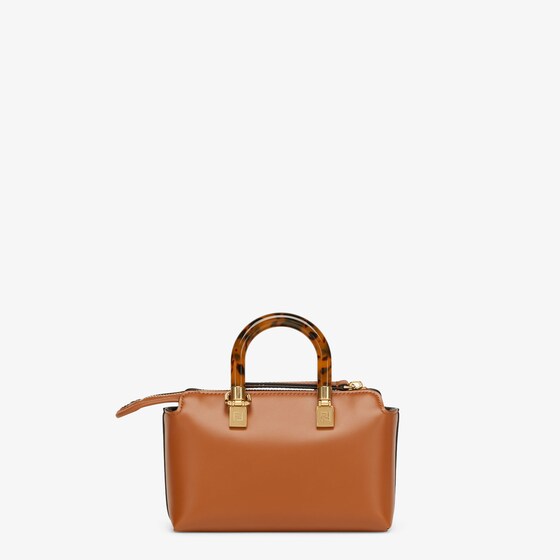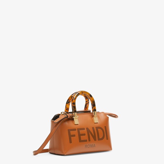 Iconic mini By The Way Boston bag made of brown leather with hot-stamped FENDI ROMA lettering and rigid tortoiseshell-effect plexiglass handles. Zip fastening.