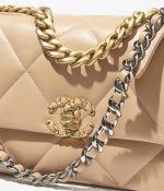 The Medium 19 Flap Bag is crafted from light beige lambskin with mixed metal hardware and features signature diamond quilting, signature CC interlocking clasp, exterior back pocket, chain top handle and long mixed metal and light beige leather chain