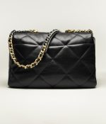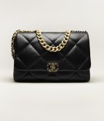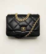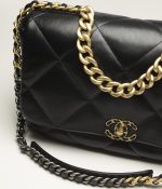 This oversized 19 flap bag is crafted in black lambskin with mixed metal hardware and features signature diamond quilting, the signature 19 CC interlocking clasp, exterior back pockets, chain top handles and a long shoulder strap in brushed gold, ruthenium and silver tones and a black leather chain.
