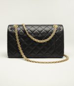 The Reissue 2.55 Single Flap Bag is crafted from distressed black calfskin with antique gold hardware, front flap with Mademoiselle turnlock closure, half-moon back pockets and interwoven gold chain links.