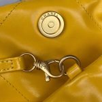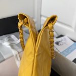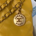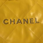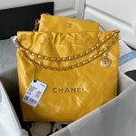 This small 22 Hobo bag is made of yellow calfskin with gold-tone hardware and features the signature diamond quilting, gold-tone metal CHANEL lettering on the front, a removable pouch and a long gold-tone and pink leather chain.