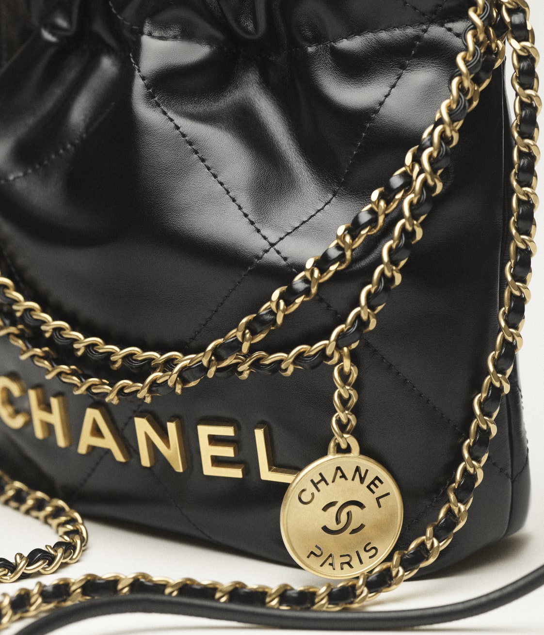 This Mini 22 Hobo Bag is in metallicblack calfskinwith gold tone hardware,CHANEL on the front ingold tone metal, a short gold tone and leather interwoven chain, a long one, and a long leather cord strap.