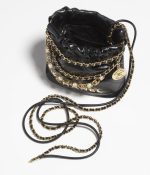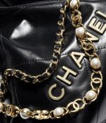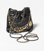 This Mini 22 Hobo Bag is in black calfskin leather with gold tone hardware, has the signature diamond quilt, a gold tone metal “Chanel” logo on front of bag, Chanel Paris metal hang tag, interwoven chain link with gold metal and black leather shoulder straps, one long leather cord and one faux pearl and gold chainlink top handle and one leather and gold chainlink top handle.