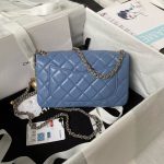 This mini rectangular pearl flap bag is crafted in blue lambskin with brushed gold hardware, front flap with signature CC turnlock closure, back half-moon pocket, single interwoven blue leather and brushed gold chain link shoulder/crossbody strap with adjustable pearl ball.