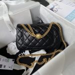 This Camellia Crush Mini Rectangular Flap bag is in Rose Clair lambskin leatherwith antiquegold tone hardware and features a front flap with CC turnlock closure, back half moon pocket and adjustable interwoven antique gold tone chain link shoulder/crossbody strap with camellia flower attachment.