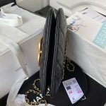 This CC shoulder bag is made of black lambskin with antique gold hardware, tonal stitching, square structure, large antique gold CC clasp that folds over the front top of the bag.