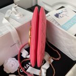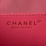 This CC shoulder bag is made of fuchsia lambskin with antique gold hardware, tonal stitching, square construction, large antique gold CC clasp that folds over the front top of the bag.