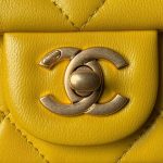This Chanel Small Flap Bag in yellow lambskin with antique gold hardware features a front flap closed with the signature CC turnlock clasp, tone-on-tone stitching, adjustable antique gold interwoven chain links and a yellow leather shoulder strap with a “pearl” ball attachment.