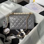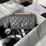 This Chanel Pearl Top Handle Flap Bag is crafted in grey shiny lambskin with gold hardware and features signature diamond quilted leather, front CC turnlock closure, rear exterior pocket, and gold and pearl top handle leather shoulder strap.