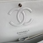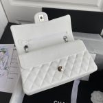 This medium classic double flap bag is crafted in white caviar leather with silver-tone hardware, featuring the signature CC turnlock closure on the front flap, half-moon back pocket, adjustable interwoven silver-tone chain and white leather shoulder strap.