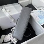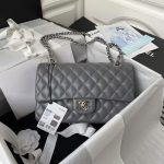 This medium classic double flap bag is crafted in grey lambskin with silver hardware, featuring the signature CC turnlock closure on the front flap, half-moon back pocket, adjustable interwoven silver chain and grey leather shoulder strap.