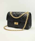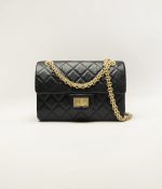 This Mini Reissue 2.55 Single Flap Bag is crafted from black distressed calfskin with antique gold hardware, front flap with Mademoiselle turnlock closure, half-moon back pockets and interwoven gold chain links.