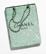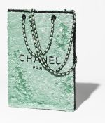 This shopping bag is made of green sequins, ribbed satin and leather with black hardware, tonal stitching, a removable interior pocket, interwoven black metal chain links and a green leather shoulder strap.