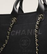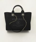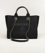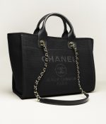 This Small Deauville bag is made of black canvasfabric withlight gold tone hardware has a large CC signature and Chanel logo on the front, removable pouch and interwovenlight gold tone chain link and black leather shoulder straps.