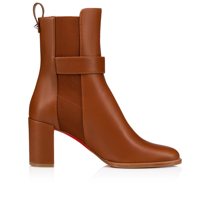 The CL Chelsea booty boot showcases clean lines and timeless elegance. With its almond shape and elastic insert on the side, it is crafted in Cuoio brown calf leather. Set on a 70 mm heel, it has a strap with a silver metal CL monogram. This urban style features a heel tab adorned with a Maison Christian Louboutin signature spike.