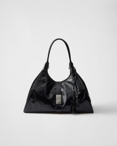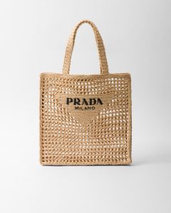 This crochet tote bag with a soft, deconstructed design boasts a light and summery mood. A new interpretation of Prada’s emblematic triangle decorates the front and is embellished at its center with the embroidered lettering logo.