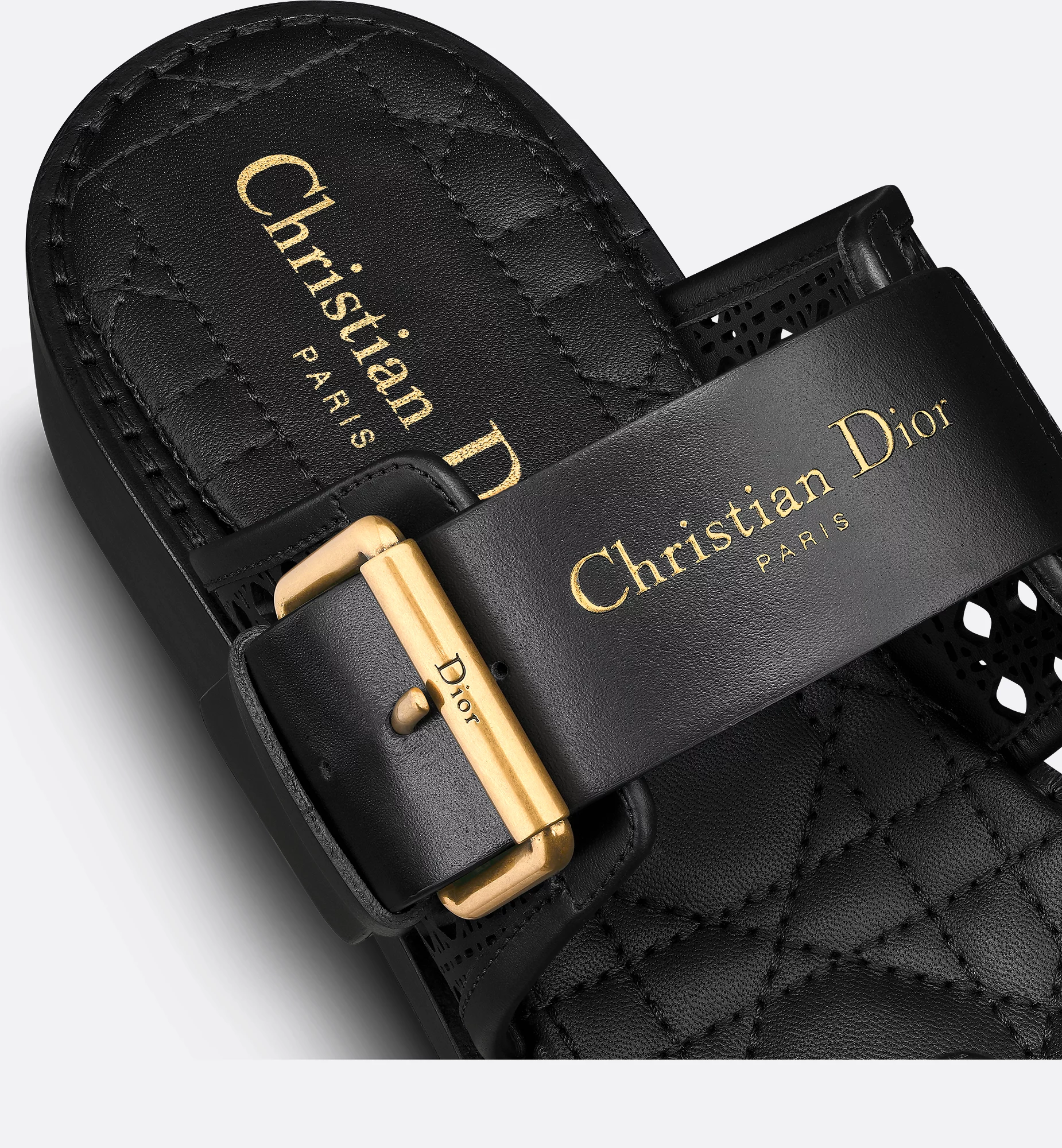 New for Cruise 2025, the D-Avenue slide is an urban and elegant creation. Crafted in black openwork Microcannage calfskin, it features two straps embellished with adjustable buckles and the gold-tone Christian Dior Paris signature on the upper strap. Completed by a comfortable padded Microcannage sole, the slide will lend a refined touch to any casual look.