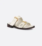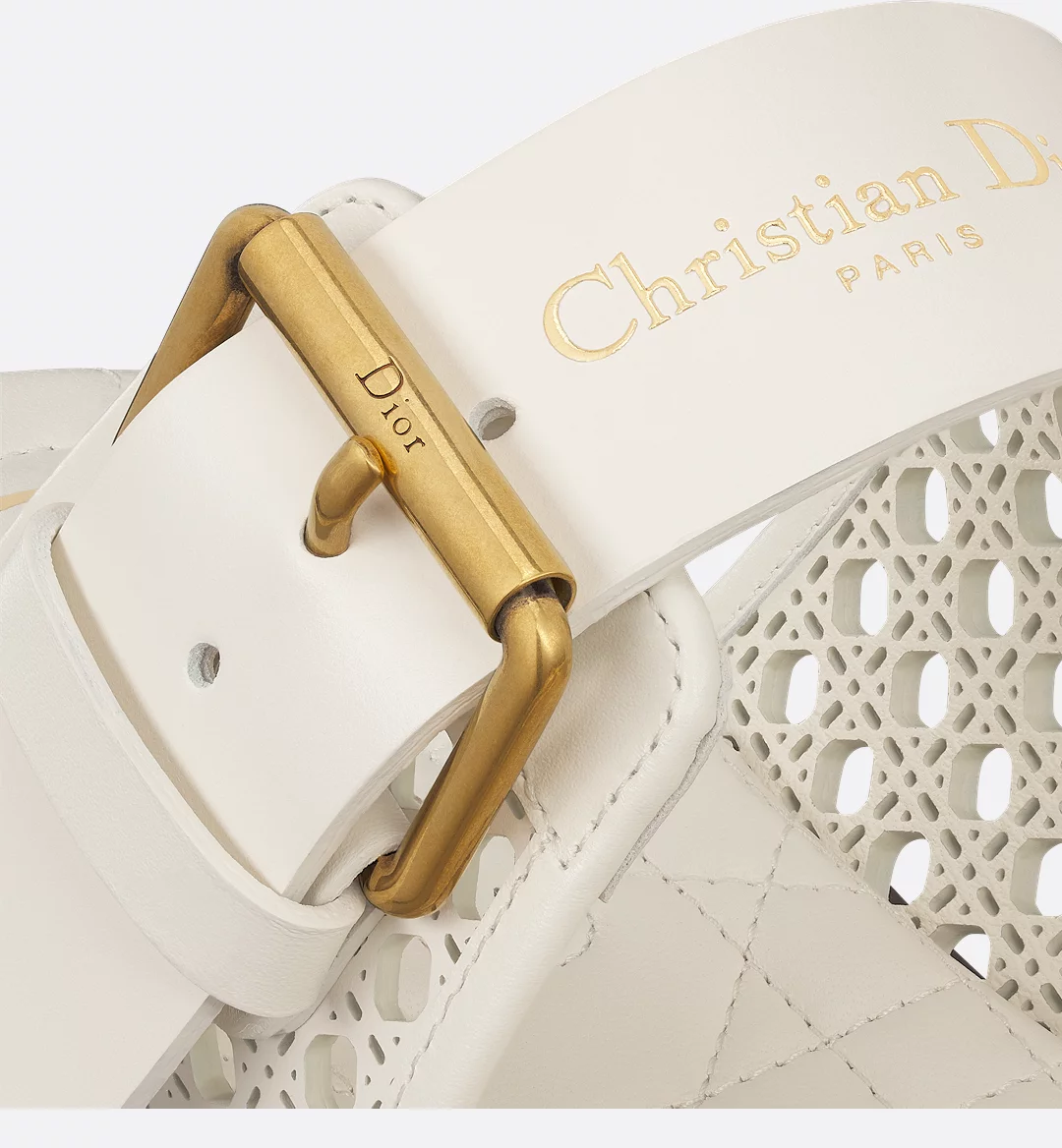 New for Cruise 2025, the D-Avenue slide is an urban and elegant creation. Crafted in white openwork Microcannage calfskin, it features two straps embellished with adjustable buckles and the gold-tone Christian Dior Paris signature on the upper strap. Completed by a comfortable padded Microcannage sole, the slide will lend a refined touch to any casual look.