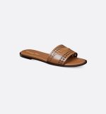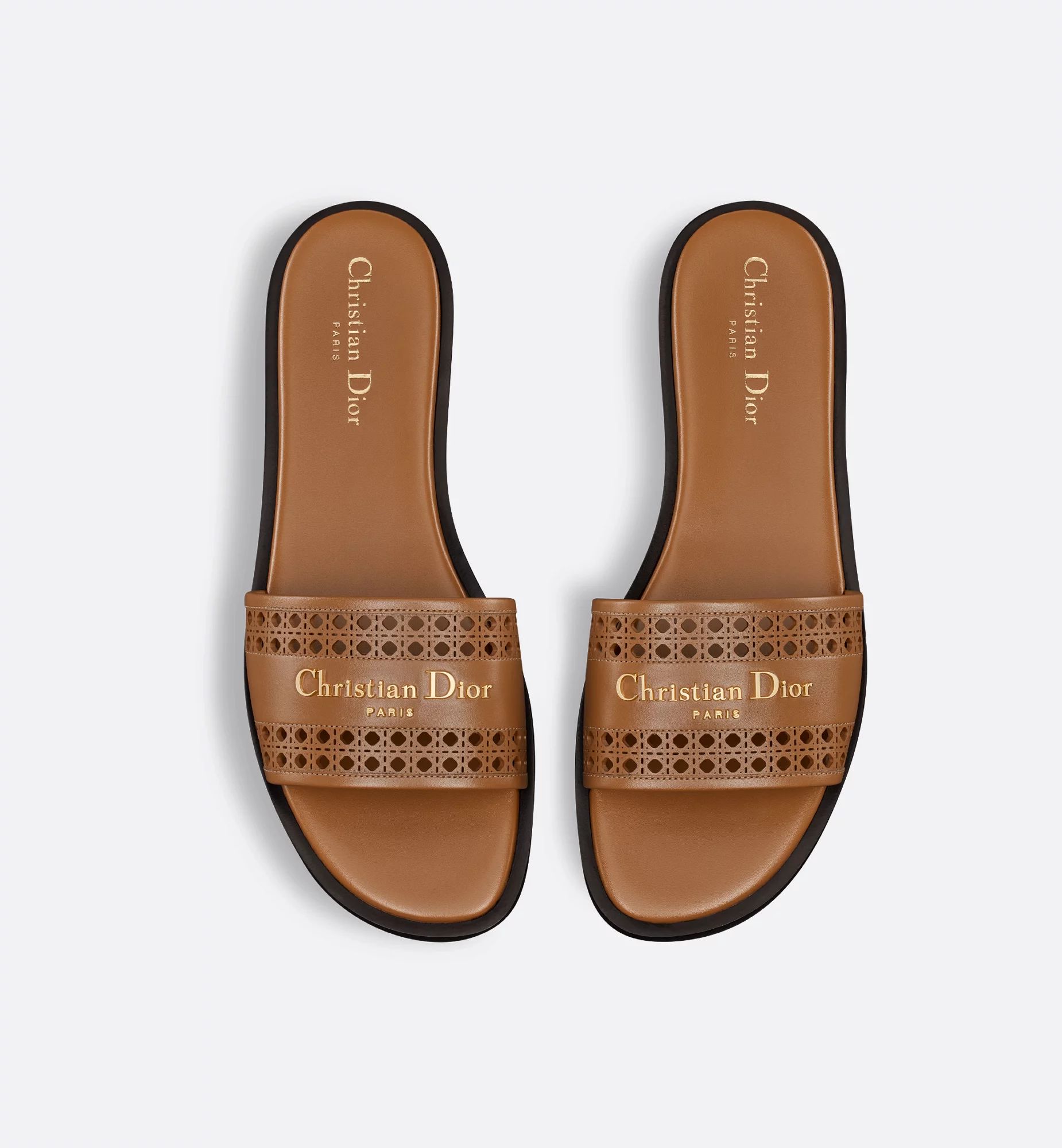 The D-Lane slide is an emblematic style with a timeless look. The camel openwork Microcannage calfskin upper is adorned with a gold-finish metal Christian Dior Paris signature, adding an instantly recognizable touch. The padded leather insole offers ultimate comfort while the streamlined design makes it easy to slip on for a laid-back look.