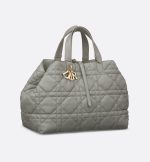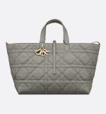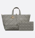 The Dior Toujours bag is distinguished by a casual and practical design. Crafted in stone gray calfskin with Macrocannage topstitching, it showcases a spacious interior compartment with a matching pouch to organize the essentials. Its thin leather strap closure keeps items secure while the D of the CD Lock clasp twists to adjust the sides and enhance the bag’s silhouette. The leather handles can be adjusted using the small notches in order to be able to carry the large bag by hand or wear it over the shoulder.