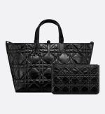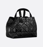 The Dior Toujours bag is distinguished by a casual and practical design. Crafted in black crinkled calfskin with Macrocannage topstitching, it showcases a spacious interior compartment with a matching pouch to organize the essentials. Its thin leather strap closure keeps items secure while the D of the CD Lock clasp twists to adjust the sides and enhance the bag’s silhouette. The leather handles can be adjusted using the small notches in order to be able to carry the large bag by hand or wear it over the shoulder.