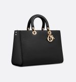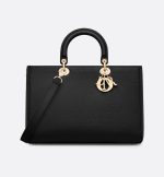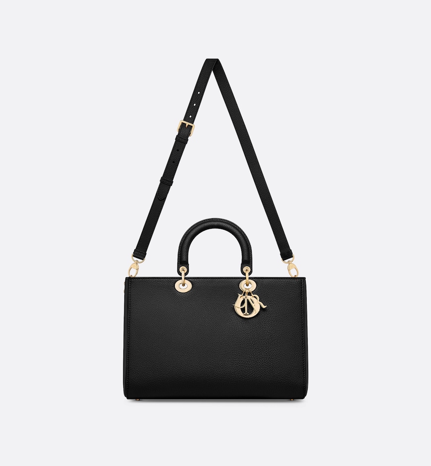 New for Summer 2024, the Lady D-Sire bag draws inspiration from the signature elegance of the Lady Dior design. Reimagined with a casual style for an urban look, the lightweight black grained Taurillon leather feels soft to the touch yet offers excellent durability. The large style is embellished with pale gold-finish metal D.I.O.R. charms highlighting the silhouette. Showcasing a removable, thin leather shoulder strap, the unique bag can be carried by hand or over the shoulder.