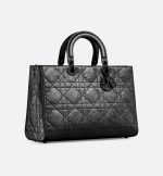 New for the season and appearing in the Spring-Summer 2024 Fashion Show, the Lady D-Sire bag draws inspiration from the iconic elegance of the Lady Dior design. Reimagined with a casual style for an urban look, the black crinkled calfskin is accented by Macrocannage topstitching, while tonal ultra-matte metal D.I.O.R. charms lend a modern touch. Featuring a thin, removable leather shoulder strap, the unique large bag can be carried by hand or worn over the shoulder.
