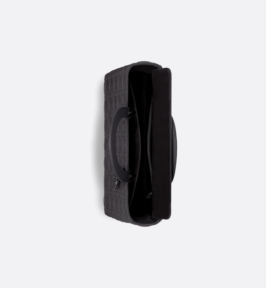 The Lady Dior bag epitomizes the House’s vision of elegance and beauty. Sleek and refined, the timeless yet relevant style is crafted in black ultramatte calfskin with Cannage stitching, creating the instantly recognizable quilted texture. The tonal metal D.I.O.R. charms offer elegant appeal. Featuring a thin, removable leather strap, the large Lady Dior bag can be carried by hand, worn over the shoulder or crossbody.