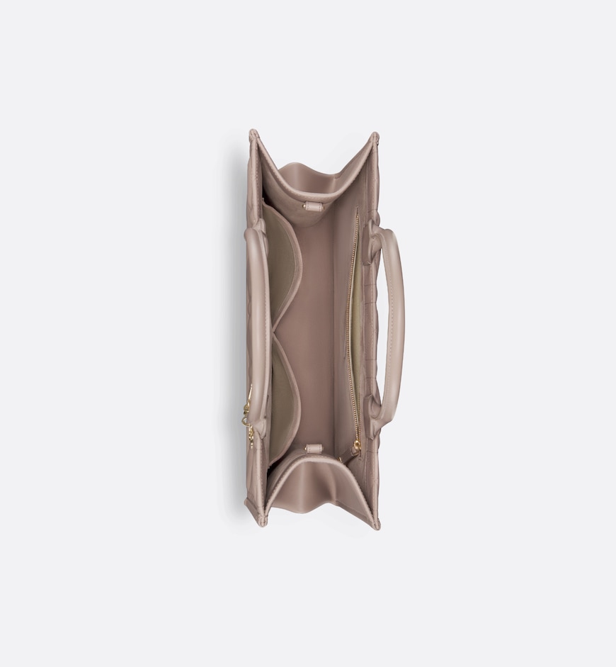 Maria Grazia Chiuri’s hallmark Dior Book Tote offers an original take on elegance. Crafted in warm taupe calfskin, the design showcases the Macrocannage motif and is embellished with pale gold-finish metal D.I.O.R charms on one of the handles. The cashmere leather interior reveals a zip pocket and patch pockets, ideal for organizing all the daily essentials. Featuring an adjustable and removable strap, the lightweight and practical medium tote is a prime example of Dior savoir-faire and may be carried by hand or worn over the shoulder.