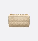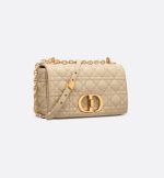 The Dior Caro bag combines modernity with timeless elegance. The style is crafted in beige supple calfskin with Cannage stitching. The bag showcases a flap adorned with an antique gold-finish metal CD twist clasp, inspired by the seal of a Christian Dior perfume bottle. The detachable chain shoulder strap with CD signature links allows the medium bag to be carried by hand, worn over the shoulder or crossbody, and may be replaced by one of the House’s wide embroidered straps for day or evening attire.