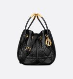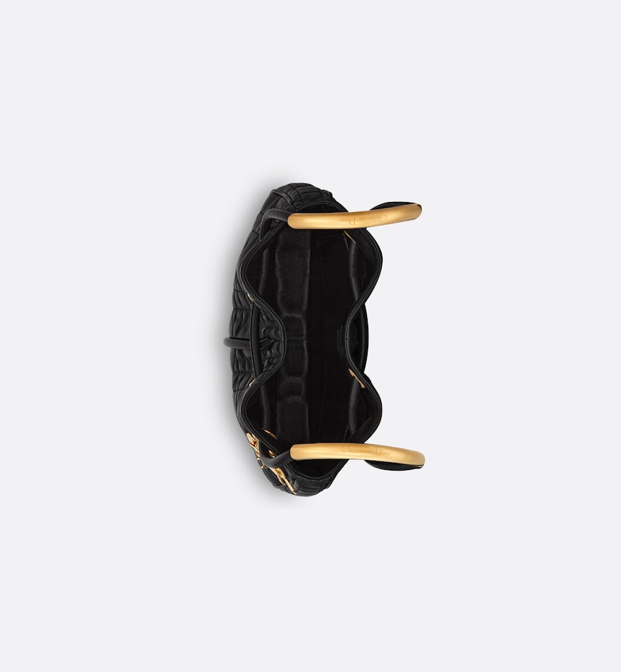 New for Fall 2024, the Dior Nolita bag redefines House codes of modern elegance with a refined and contemporary silhouette. The black Macrocannage lambskin is complemented by structured top handles embellished with antique gold-finish metal, as well as sliding D.I.O.R. charms which lend a touch of movement. The drawstring closure reveals a practical interior with a slip pocket, while the adjustable and removable leather strap allows the medium bag to be carried by hand, worn over the shoulder or crossbody.