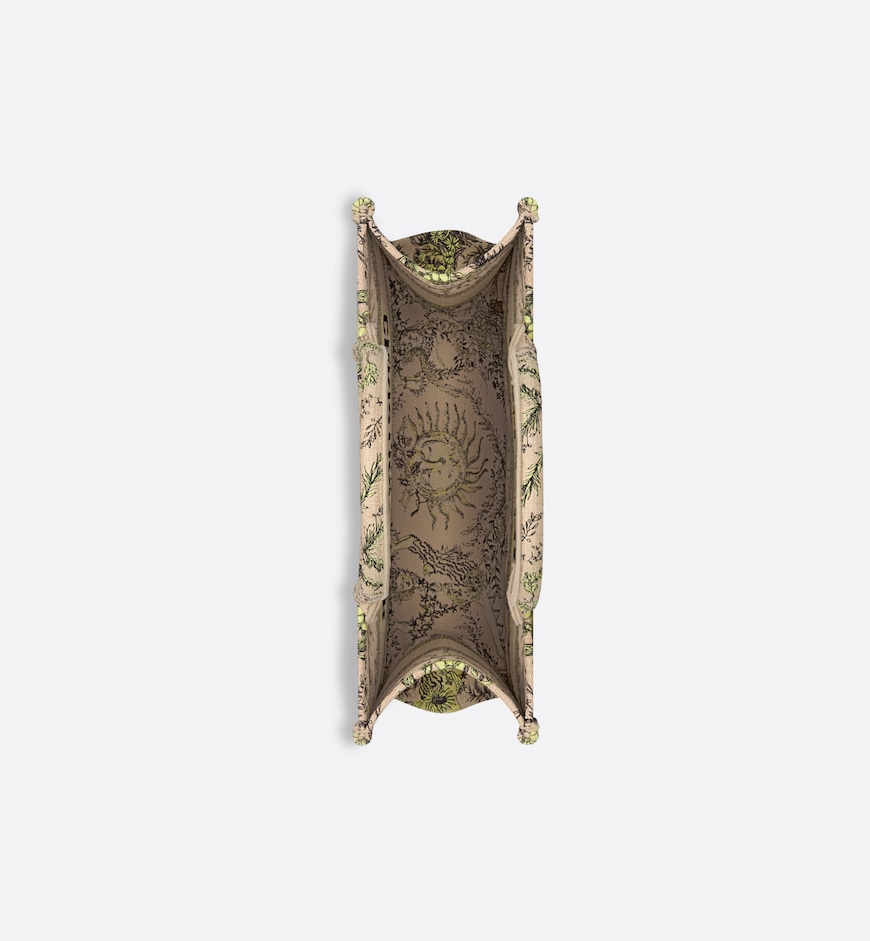 Introduced by Maria Grazia Chiuri, Creative Director of Christian Dior, the Dior Book Tote has become a staple of the Dior aesthetic and is part of the Dioriviera capsule. Designed to hold all the daily essentials, the style is crafted in raffia embroidered with the Toile de Jouy Soleil motif in lemon yellow, offering a new take on the House icon layering suns and crescent moons into a floral pattern representing the four seasons. Exemplifying House savoir-faire, the medium tote is adorned with the Christian Dior Paris signature on the front. It can be carried by hand or worn over the shoulder.