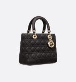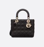 The Lady Dior bag epitomizes the House’s vision of elegance and beauty. Sleek and refined, the timeless creation is crafted in black grained calfskin with Cannage stitching, creating the instantly recognizable quilted texture. The pale gold-finish metal D.I.O.R. charms offer an elegant appeal. Featuring a thin, removable leather shoulder strap, the medium Lady Dior bag can be carried by hand or worn crossbody.