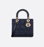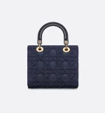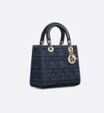 The Lady Dior bag embodies the House’s vision of elegance and beauty. Sleek and refined, the timeless style is crafted in blue denim showcasing the Graphic Cannage motif, offering a modern 3D version of the House icon. Pale gold-finish metal D.I.O.R. charms lend a polished look. Featuring a thin, removable leather strap, the medium Lady Dior bag can be carried by hand or worn crossbody.