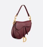 Maria Grazia Chiuri brings a fresh update to the iconic Saddle bag. Crafted in burgundy grained calfskin, the legendary design features a Saddle flap with a D stirrup strap and magnetic pull, as well as an antique gold-finish metal CD signature on either side of the handle. Equipped with a thin, adjustable and removable strap, the Saddle bag may be carried by hand, worn over the shoulder or crossbody.