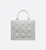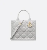 Maria Grazia Chiuri’s hallmark Dior Book Tote is presented in an elegant new variation. Crafted in cloud gray calfskin, the design showcases the Macrocannage motif and is embellished with pale gold-finish metal D.I.O.R charms. The cashmere leather interior reveals a zip pocket and slip pockets, ideal for organizing all the daily essentials. Featuring an adjustable and removable strap, the lightweight and practical small tote exemplifies Dior savoir-faire and may be carried by hand or worn over the shoulder.