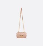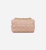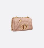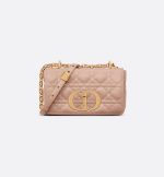 The DiorCaro bag combines modernity with timeless elegance. The silhouette is crafted in Rose des Vents supple calfskin with Cannage topstitching. The bag features a flap adorned with an antique gold-finish metal CD twist clasp, inspired by the seal of a ChristianDior perfume bottle. The detachable chain shoulder strap with CD signature links allows the small bag to be carried by hand, worn over the shoulder or crossbody and may be replaced by one of the House’s wide embroidered straps for day or evening attire.