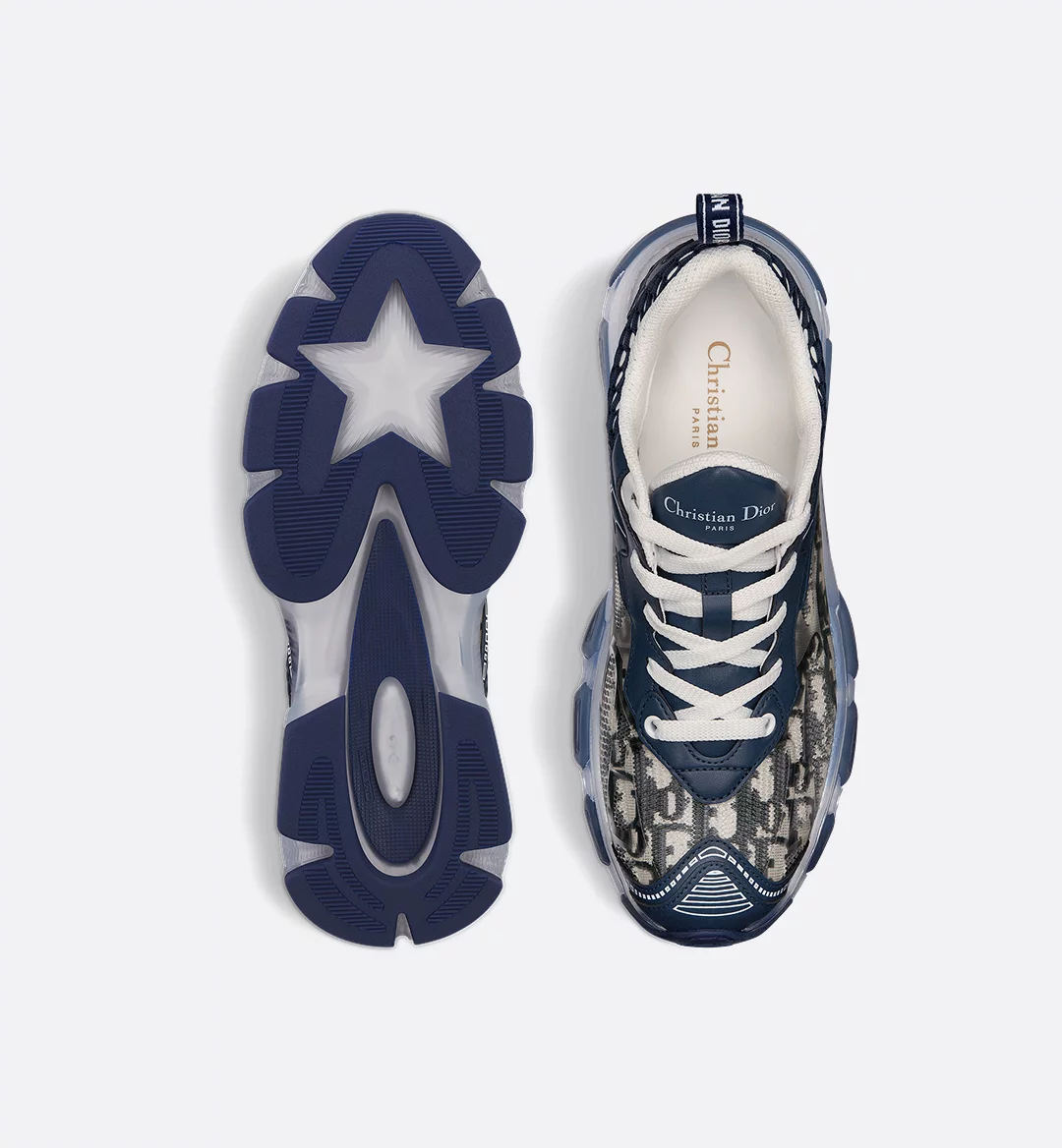 The Dior Vibe sneaker reimagines the classic running shoe with the House’s couture spirit. Combining deep blue Dior Oblique technical fabric, mesh and transparent rubber inserts, it offers a modern play on contrasts. The design is further punctuated with iconic accents like the 3D-effect details, star charm on the back and signatures on the tongue and rear tab. Completed by a transparent rubber sole, the contemporary sneaker will complement any casual or elegant attire for a contemporary look.