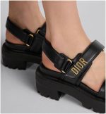 The Dioract sandal is recast into a modern platform. The anatomically shaped insole offers lightweight comfort. Crafted in black lambskin, it features self-fastening straps enhanced by a gold-finish metal Dior signature on the upper strap. The sandal will lend a contemporary touch to any look.