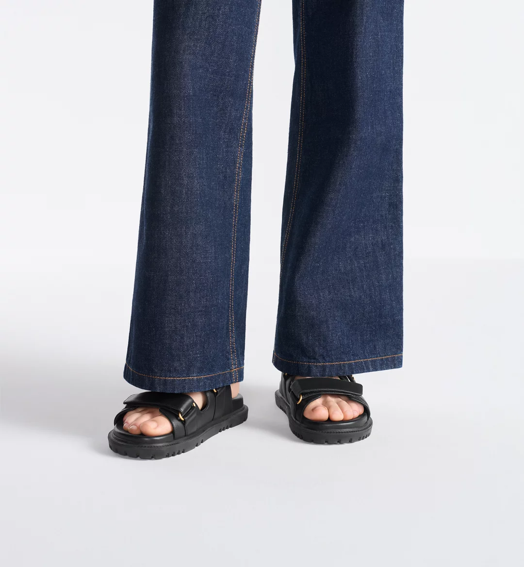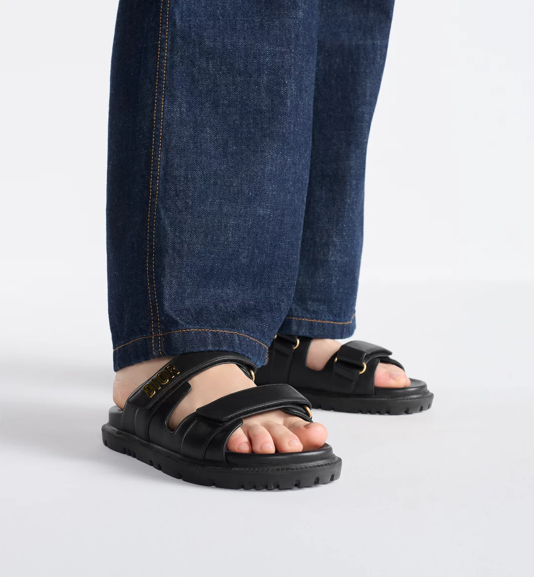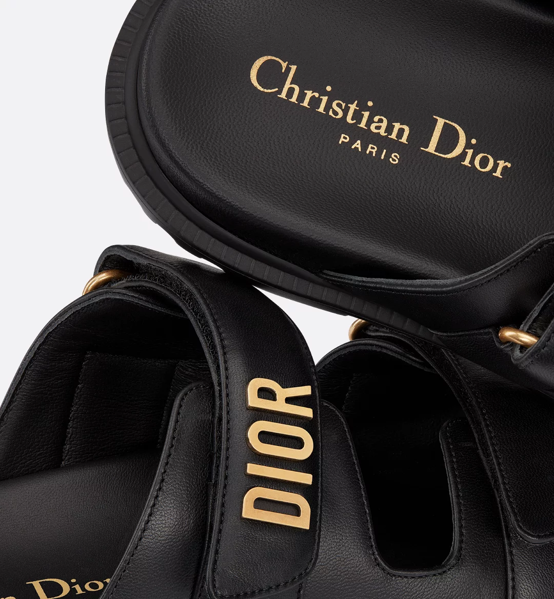 The black lambskin Dioract slide has a modern silhouette. The style features an anatomically shaped insole made with an ultralightweight and comfortable leather. Self-fastening straps are further enhanced by a gold-finish metal Dior signature on the upper strap. The slide will lend a contemporary touch to any look.